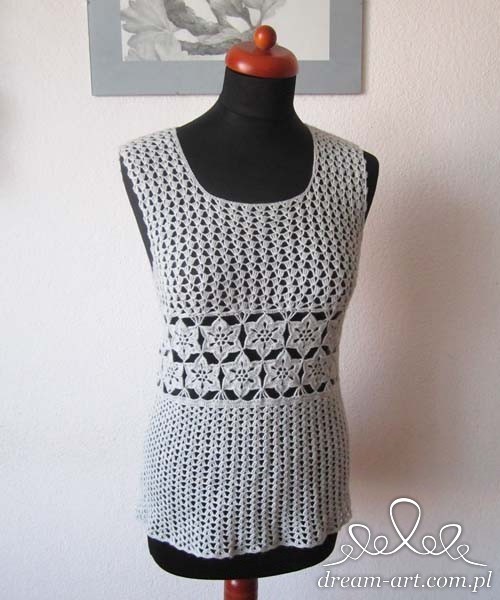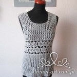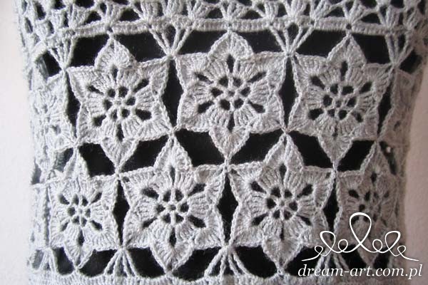 Zrobiłam kiedyś taką bluzeczkę czy tuniczkę żeby sprawdzić wydajność nitki. Jedne klientki twierdziły, że z jednego motka włóczki Kristal wychodzi bluzka inne, że trzeba trzech motków. Postanowiłam zrobić test i zobaczyć co wyjdzie z jednego motka no i oto efekt tego eksperymentu. Włoczka Kristal czy to Natura czy Madame Tricote składa się z dwóch nitek, które rozdzieliłam. Długość nitki w motku po rozdzieleniu to prawie 1000m, więc jest z czego robić. Najpierw zrobiłam 28 kwiatków, które w trakcie robienia łączyłam w dwa rzędy, potem dorabiałam górną część. W dół robiłam na okrągło dopóki starczyło mi nitki.